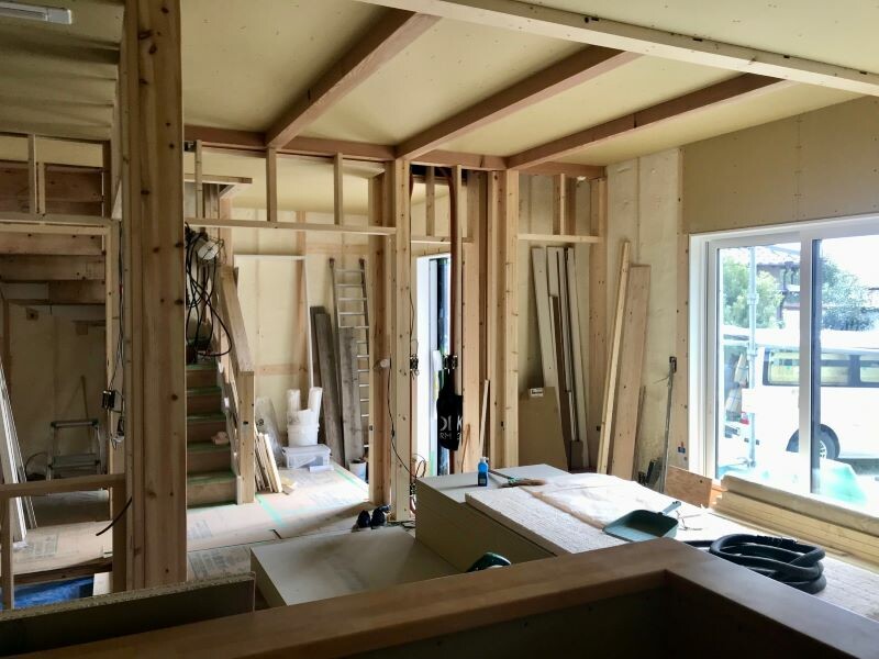 大工さんによる建物内部の造作工事は天井、床を終え、壁を施工する段階まで進んでいます。