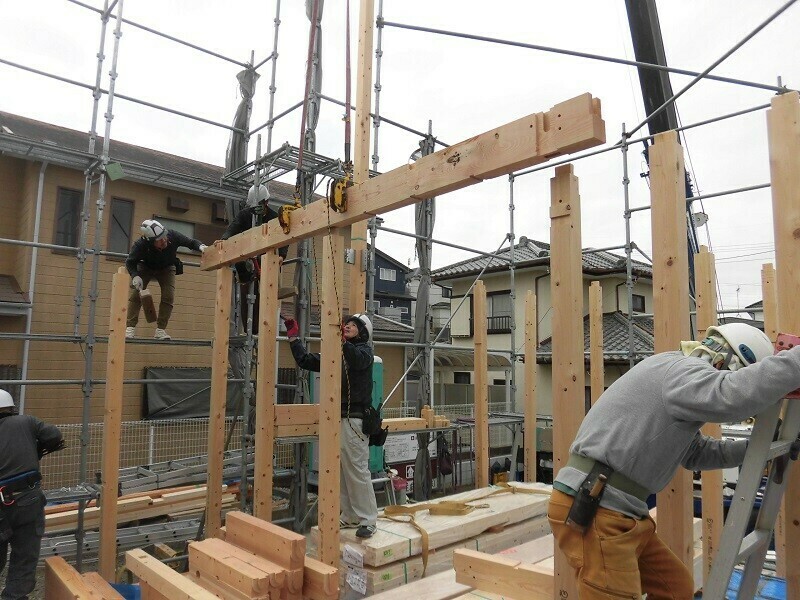 上棟日には柱や梁などの建物の基本構造となる部分の組み立て作業を大工さん数人掛かりで行います。