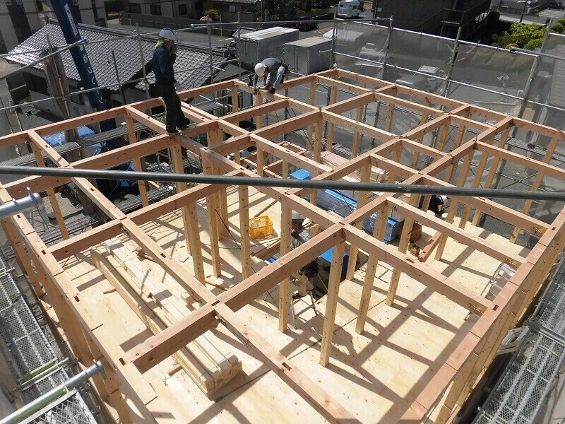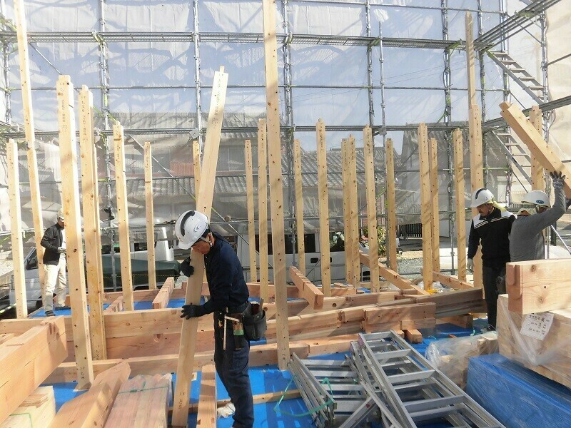 上棟日には柱や梁などの建物の基本構造となる部分の組み立て作業を大工さん数人掛かりで行います。