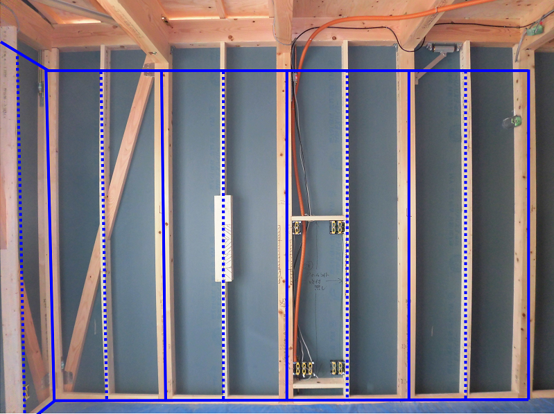 (実線がプラスターボードの端、破線がプラスターボードの真ん中のイメージです。)