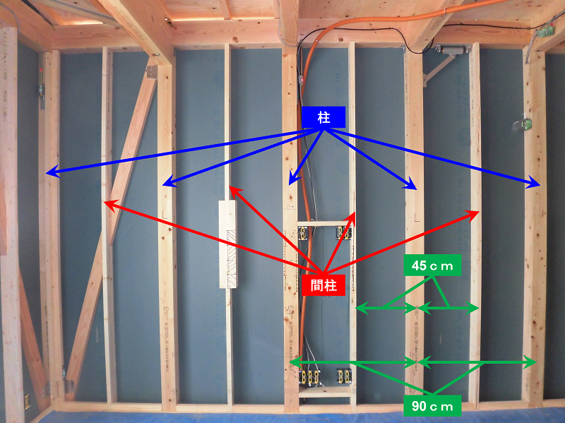 間取りにもよりますが、木造住宅の柱は写真のように90cm間隔で立っていて、その柱と柱の真ん中、45cmのところに間柱という細めの柱が立っています。