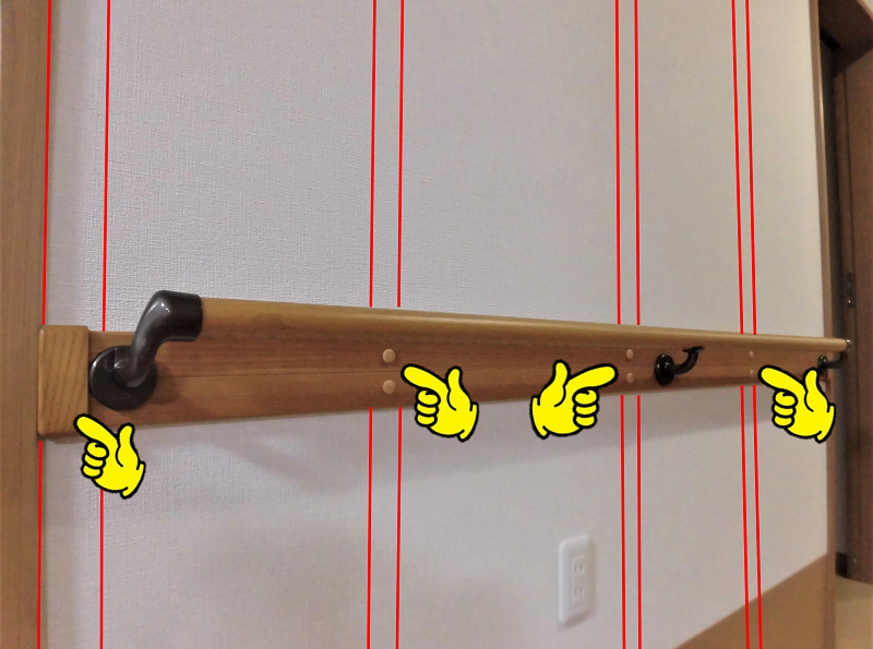 ・・・仕上がったクロスの上から柱や間柱に向けて補強板を打ち、その補強板に手摺りを固定します。