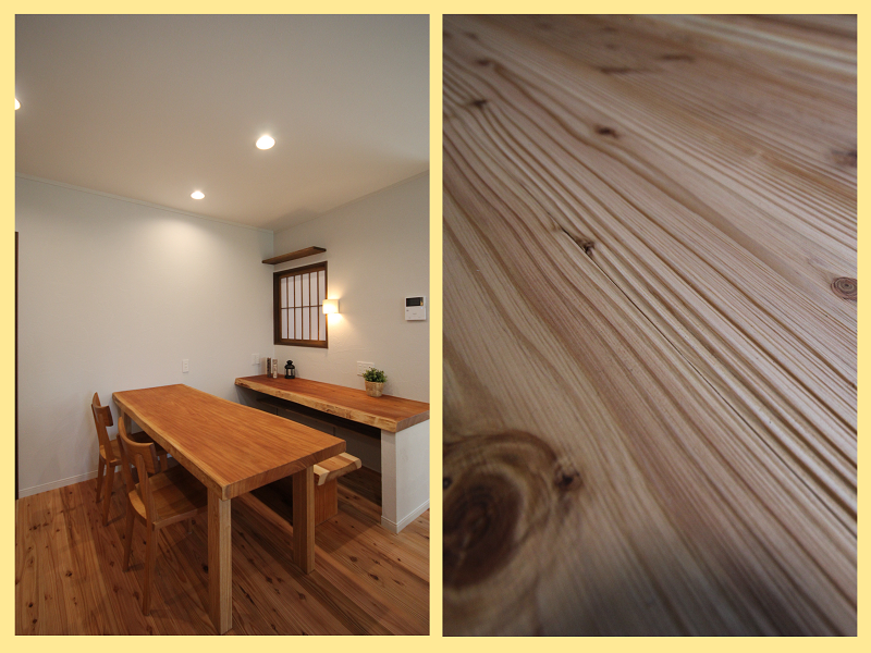 これまで何件か見学会に参加する中で、初めて触れた浮造りの杉の気持ち良さは群を抜いていたようで、床材に関しては即断即決でした。
