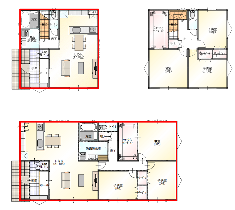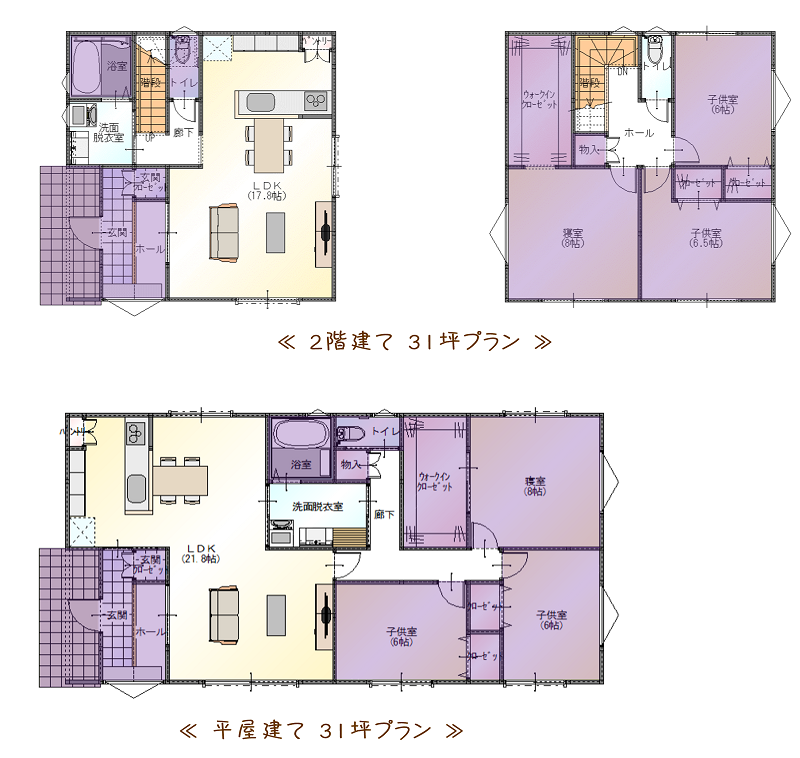 比べ易いように、玄関・寝室・子供室・収納・浴室・トイレはどちらの間取りも同じ広さに揃えてあります(図面上の薄紫色の部分)。
