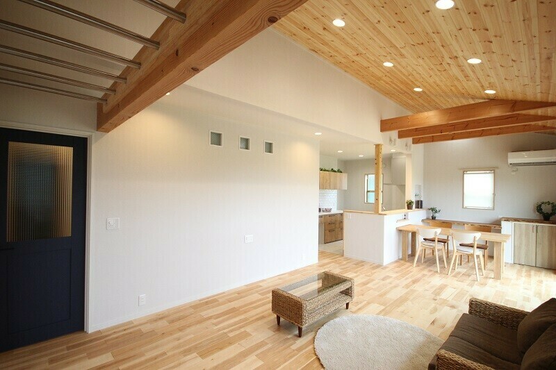 ○LDKの上に2階の間取りが乗らないことで、開放感のある勾配天井とすることが出来る。