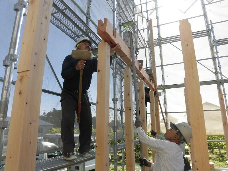 レッカー屋さんと連携を取りながら、柱のほぞを梁のほぞ穴にはめ込んでいきます。