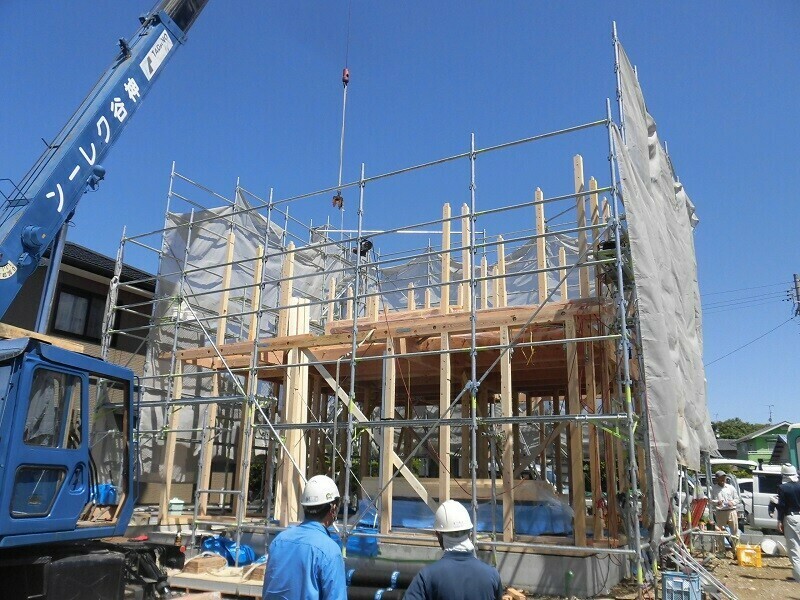 上棟日には柱や梁などの建物の基本構造となる部分の組み立て作業を大工さん数人掛かりで行います。