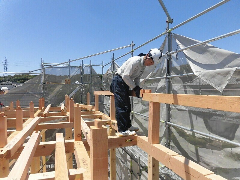 慣れないうちは梁の上を歩くのも結構怖いものですが、経験を積んだ大工さんにとってそれはお手の物。
