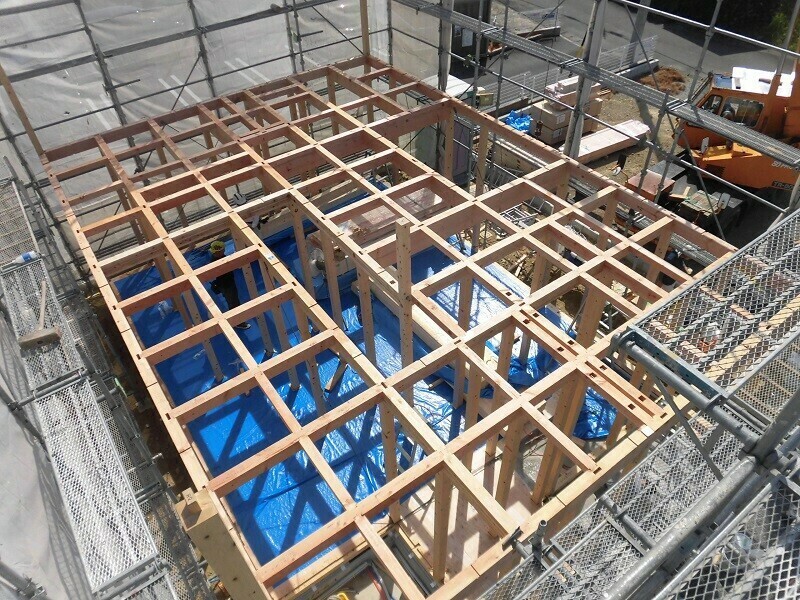 棟木が上がった後は垂木、野地板の施工へと続き、屋根の形が出来たところで作業終了です。
