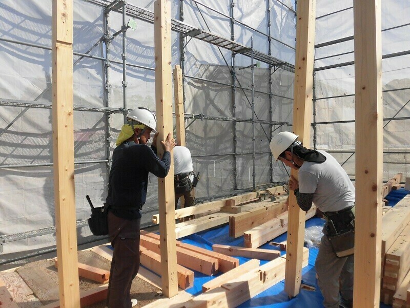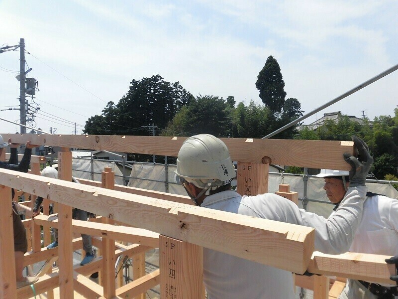 上棟日には柱や梁などの建物の基本構造となる部分の組み立て作業を大工さん数人掛かりで行います。