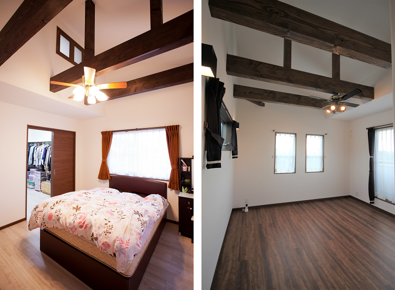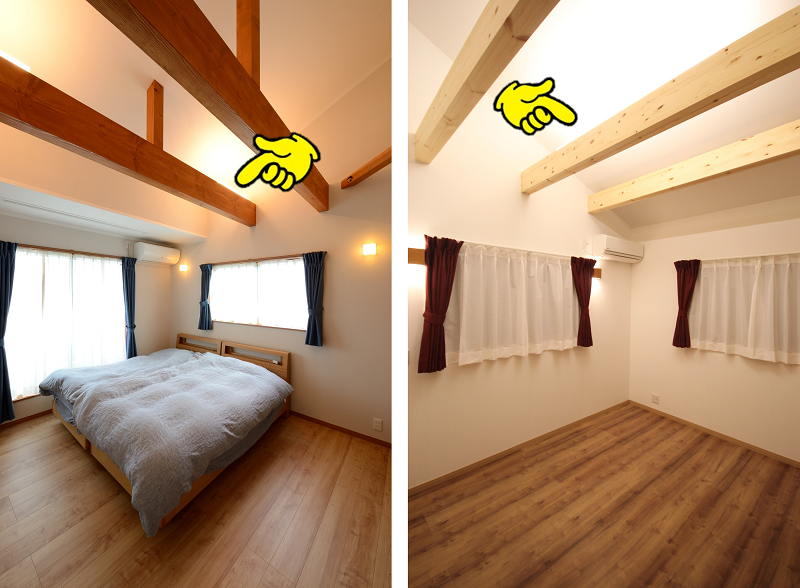 梁見せの勾配天井の寝室においては、照明器具の取付に梁を利用出来ます。