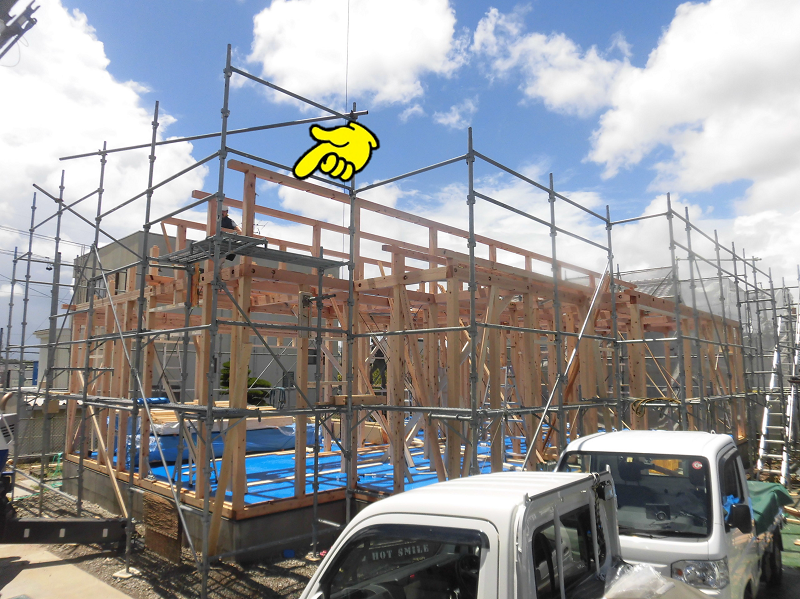 棟木というのは屋根の一番高いところに横たわって配置される木材のことを言い、Ⅰ様邸の場合、画像の矢印部分の木がそれに当たります。