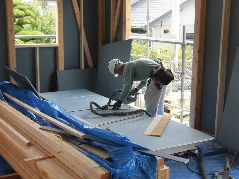 このEXハイパーですが、施工手順としてはまず寸法通りにカットして、それを外に運び出し、所定の位置に仮留めしたものを仕上げに釘打ち機で固定するという手順となります。