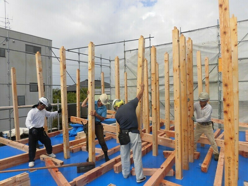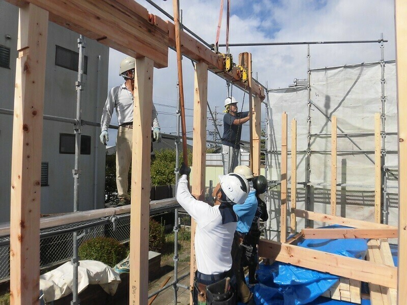 上棟日には柱や梁などの建物の基本構造となる部分の組み立て作業を大工さん数人掛かりで行います。