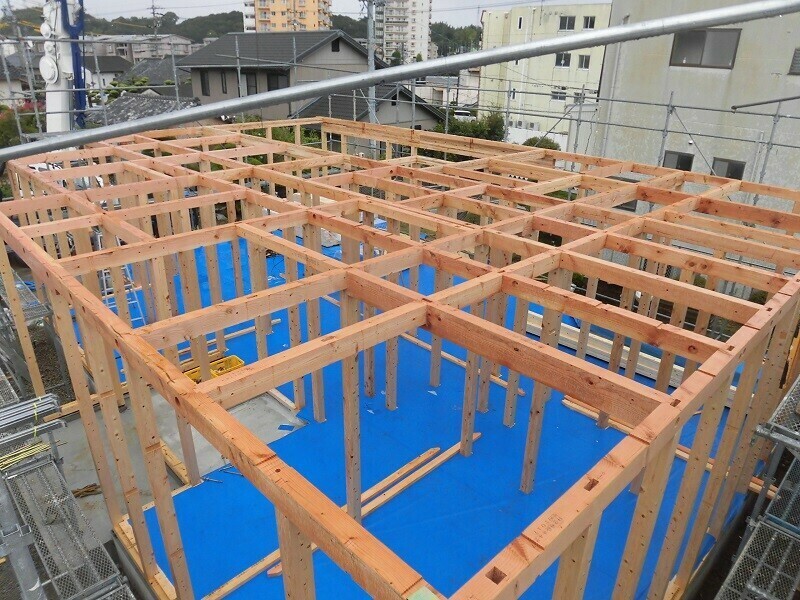 2階建ての場合、1階の梁は90cm×90cmの間隔で組まれていることが多いのですが、Ⅰ様邸は平屋のお家ということで、90cm×180cmとか、180cm×180cmといった感じで広い間隔で組まれています。