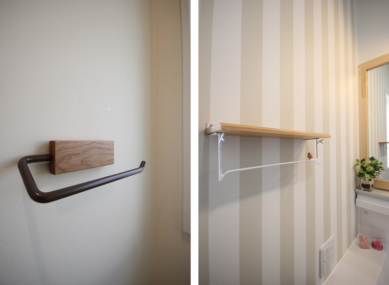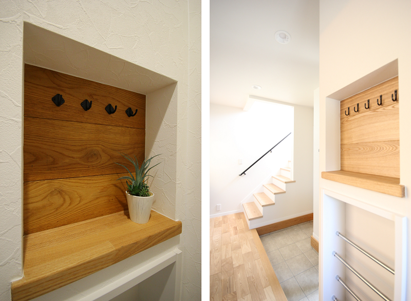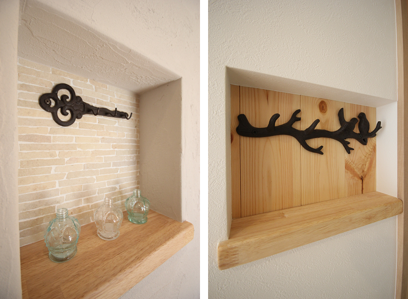 これらはニッチをこちらで造作し、背面の鍵掛け雑貨やフックをお施主様に用意してもらいました。