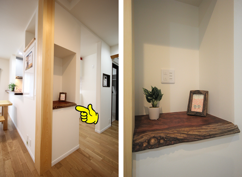 このカウンターは元々はちゃぶ台として使っていたもののようで、一枚板のちゃぶ台であった為、脚を外した天板部分を飾り棚の寸法にカットし、キレイに研磨して採り入れました。