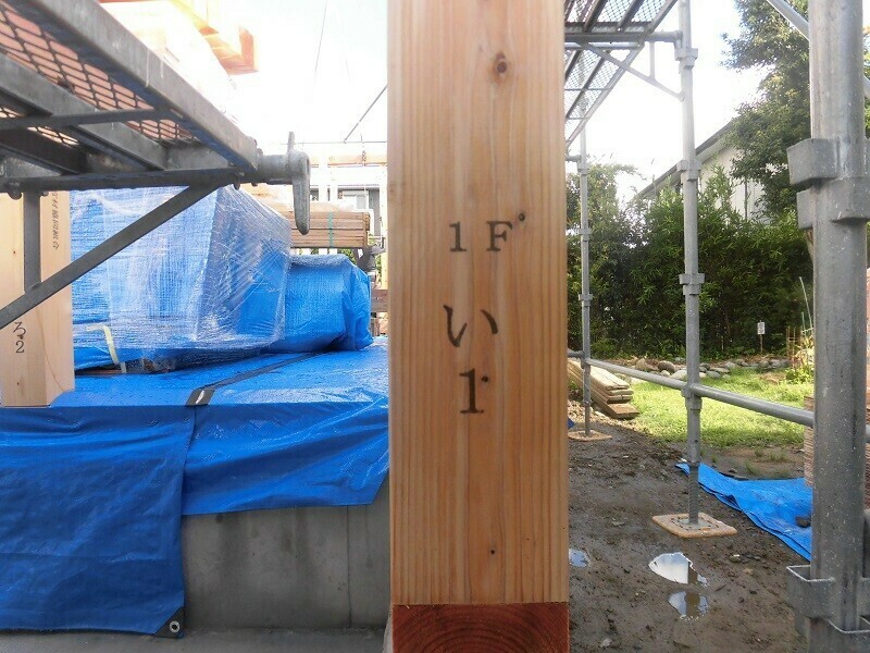 『梁を配り・・・』と記述しましたが、柱や梁など上棟の日に使う材料には全て『いろはにほへと・・・』という平仮名と『123456・・・』の数字で構成された『い1』、『ろ2』などといった『番付』が印字されています。