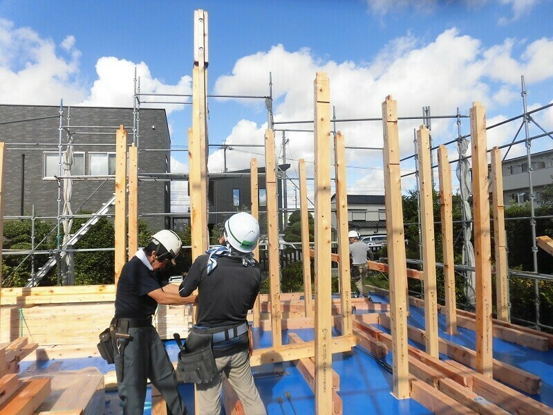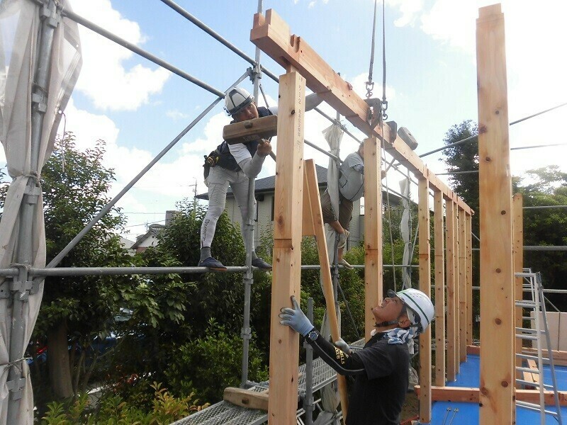 上棟日には柱や梁などの建物の基本構造となる部分の組み立て作業を大工さん数人掛かりで行います。