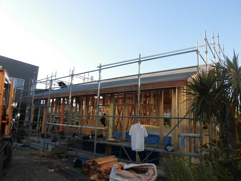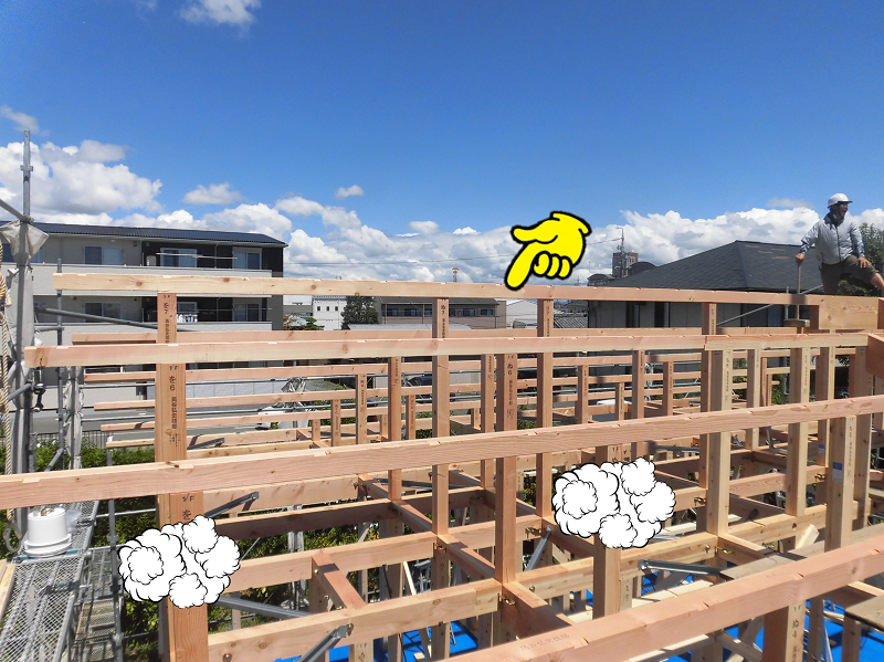 (この時期の上棟は曇っていてくれた方がありがたいと思わないでもないのですが・・・。)