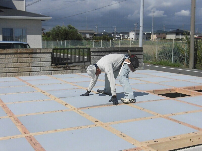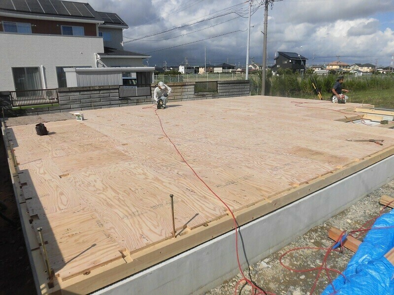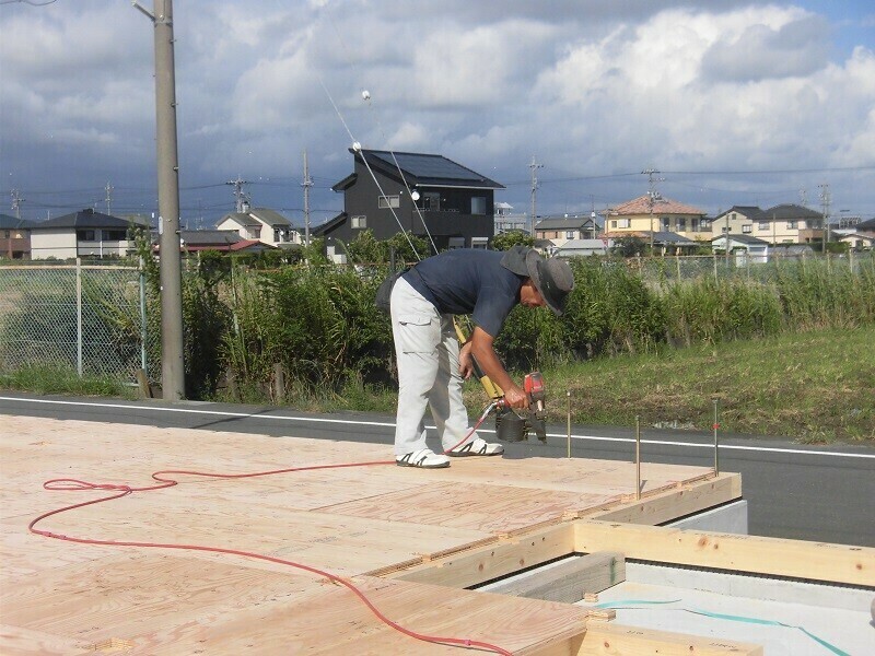 断熱材の充填作業を終えると、続いて24mmの床合板を敷き、これを釘で固定していきます。