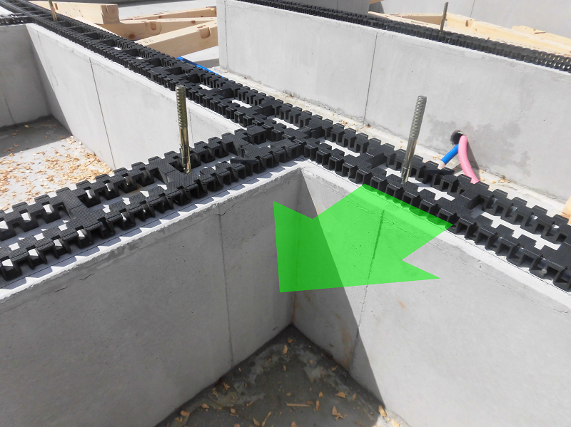 上記で説明した通り、アンカーボルト用の穴を開けられた土台は基礎の上へと据えられていくのですが、土台を据える前には上の写真のような黒い部材を基礎天端に並べます。