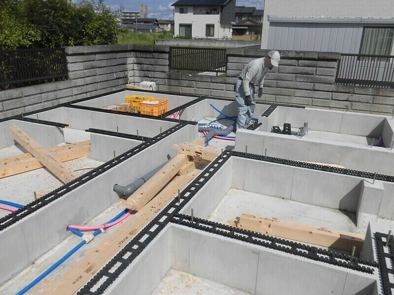 いつもなら8時頃から始める作業ですが、この日は前日に雨が降って基礎に水が溜まっていたので、7時半過ぎからそれを掻き出す作業に追われていました。