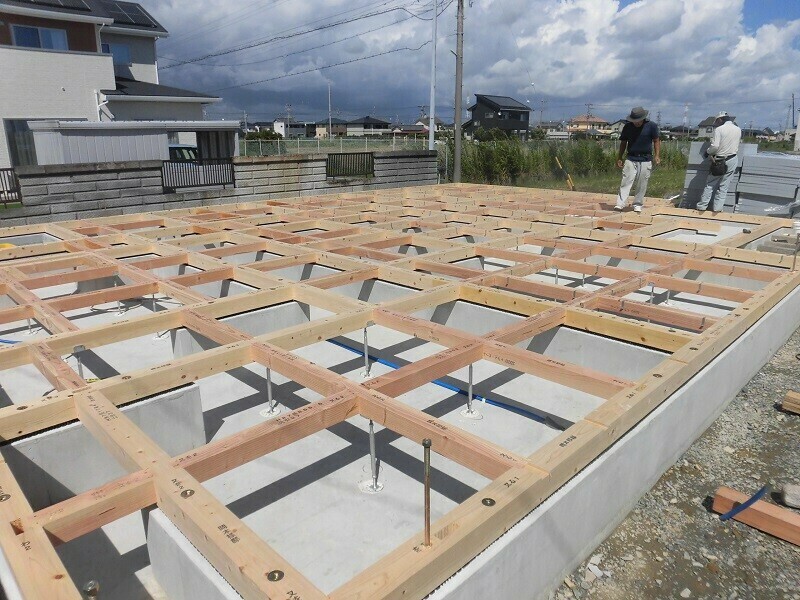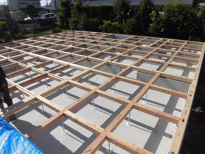 さて・・・基礎パッキンを並べた後に土台が据えられると、こんな感じで床の骨組みが出来上がります。