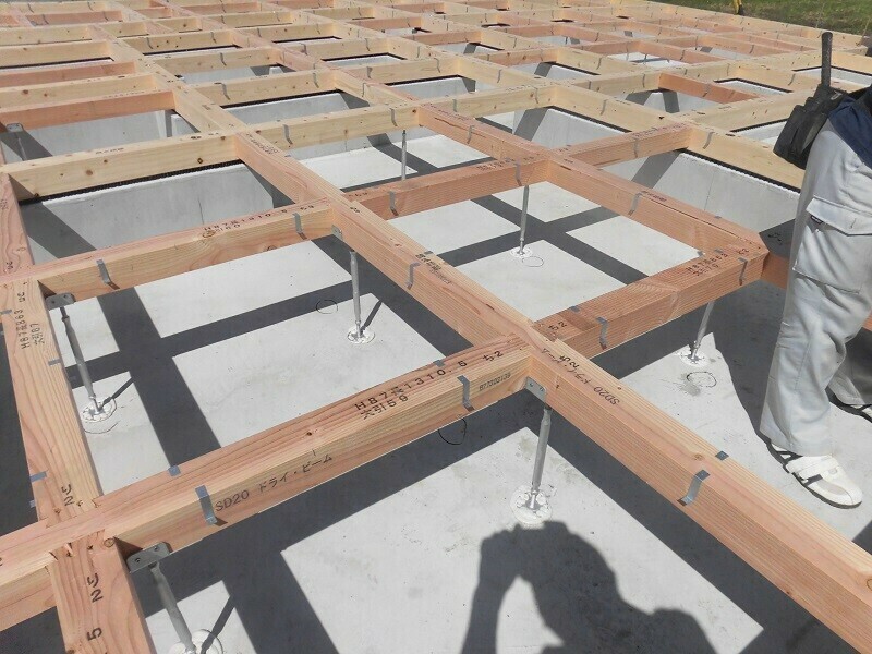 間取りにもよりますが、床の骨組みは概ね90cm×90cmのマス目になるように組まれているので、そこには基礎の立ち上がりに乗っからない部材も出てきます。