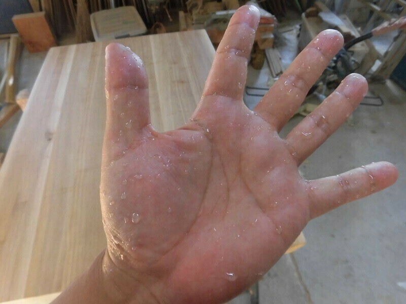蜜ロウワックスを塗った直後は掌もこんな感じで水を弾いています。