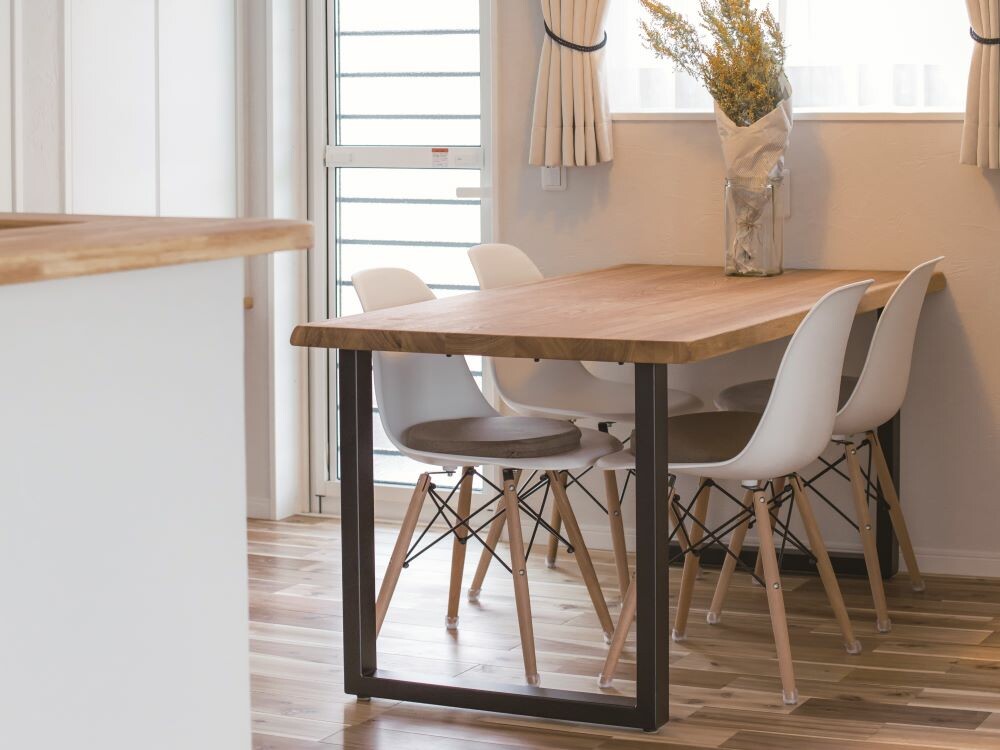 家具といっても、ソファからベッドから学習机など、いろんなものがありますが、その中で自然素材の家をコンセプトとしているほっと住まいるらしさが出せるものは何かと考えたときに、行き着いたひとつの答えが無垢板のダイニングテーブルです。