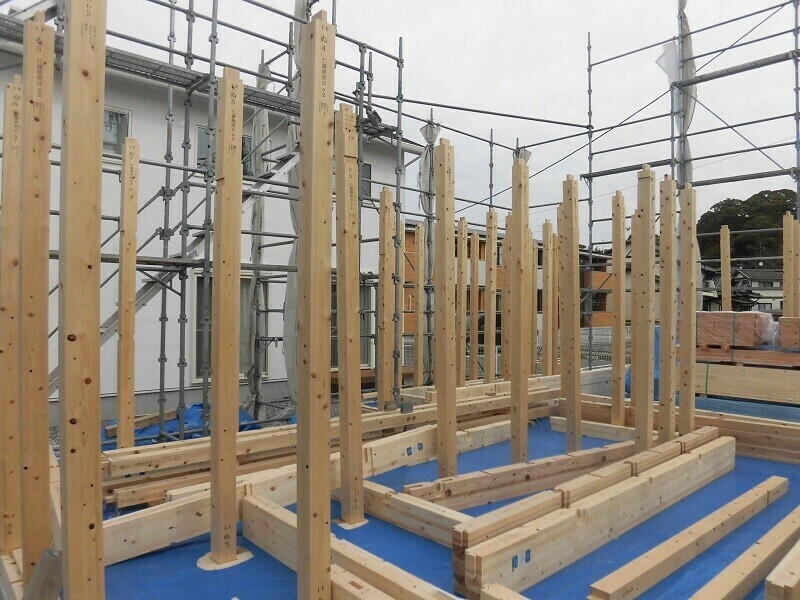 1階の梁が組み終わるとこんな感じに。