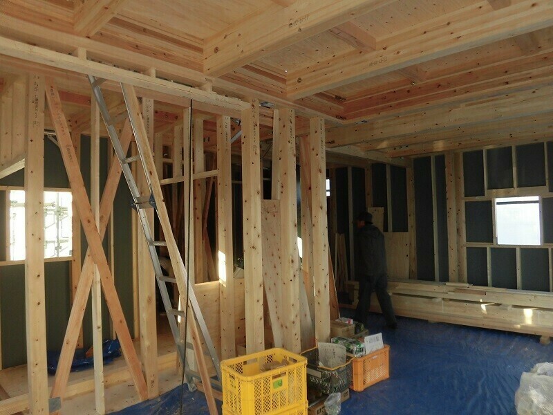 耐震上で必要となる筋交いや、間仕切壁の柱間に設置される間柱、建具上に付くまぐさ等、プレカットして現場納入された部材の取付け作業も概ね完了しました。