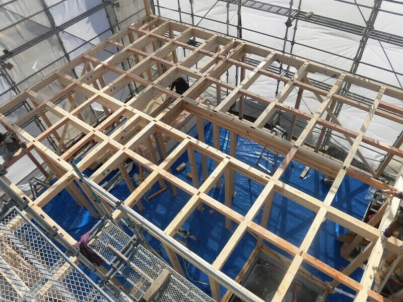 2階の梁を組み終えると、次の作業がいよいよ棟上げです。