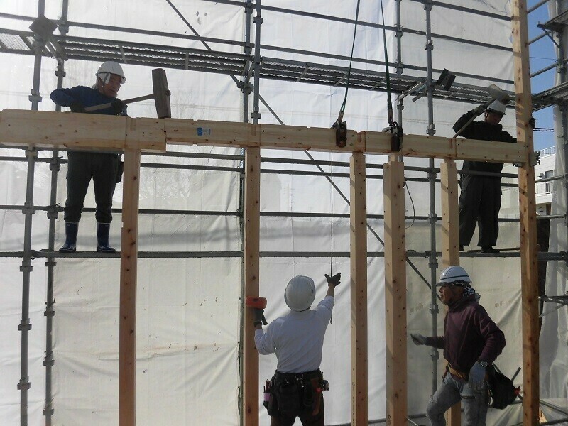 上棟日には柱や梁などの建物の基本構造となる部分の組み立て作業を大工さん数人掛かりで行います。