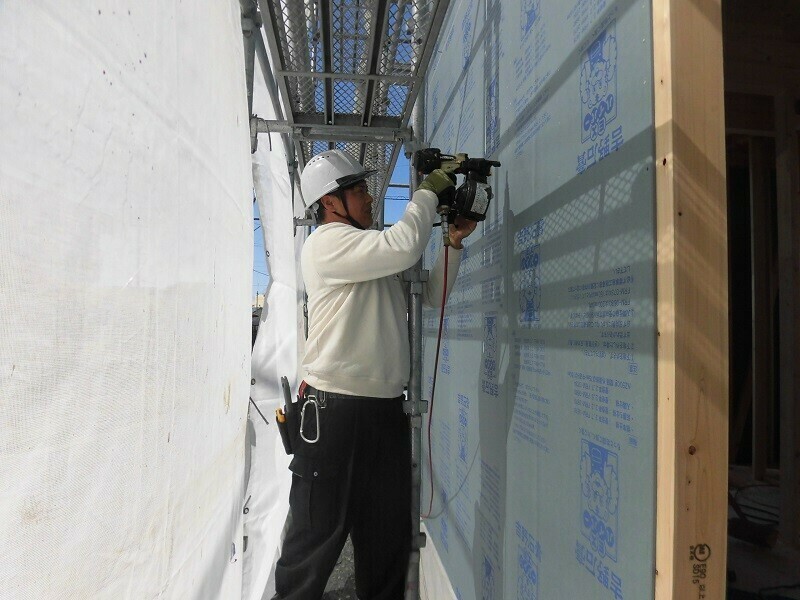 一時的に濡れてしまうのは仕方が無いにしても、雨に濡れてしまう状況を1週間も2週間も放置しておくのはやはり良くないので、2日目は耐力面材となる『EXハイパー』を張る作業を行うようにしています。