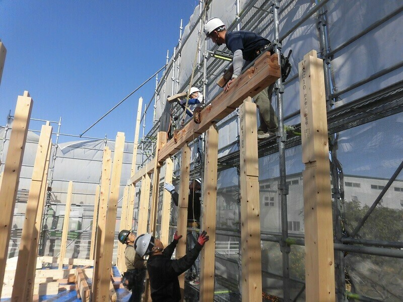 慣れないうちは梁の上を歩くのも結構怖いものですが、経験を積んだ大工さんは流石というべきです。