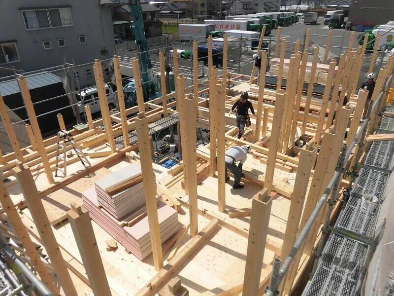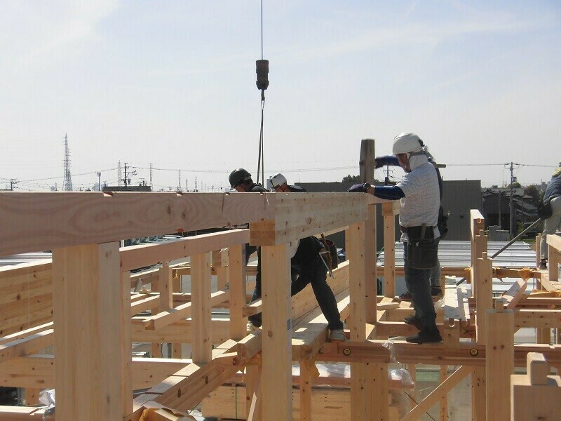 上棟日には柱や梁などの建物の基本構造となる部分の組み立て作業を大工さん数人掛かりで行います。