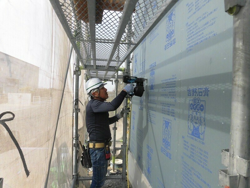 このEXハイパーですが、施工手順としてはまず寸法通りにカットして、それを外に運び出し、所定の位置に仮留めしたものを仕上げに釘打ち機で固定するという手順となります。