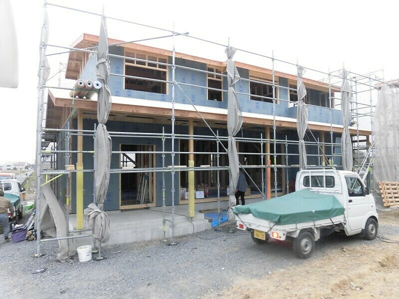 一時的に濡れてしまうのは仕方が無いにしても、雨に濡れてしまう状況を1週間も2週間も放置しておくのはやはり良くないので、2日目は耐力面材となる『EXハイパー』を張る作業を行うようにしています。