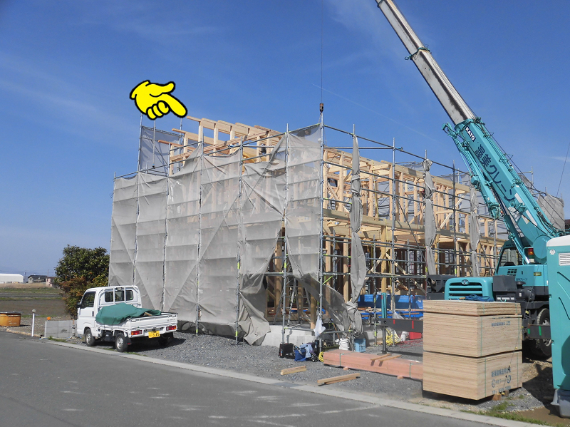 棟木が上がるのはいつもはお昼前後の時間帯なのですが、S様邸は最近にしては大きめのお家だったので、ここまで辿り着くのに少々時間が掛かってしまいました。
