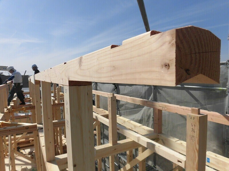 さて、棟木というのは屋根の一番高いところに横たわって配置される木材のことを言い、S様邸の場合、画像の矢印部分の木がそれに当たります。