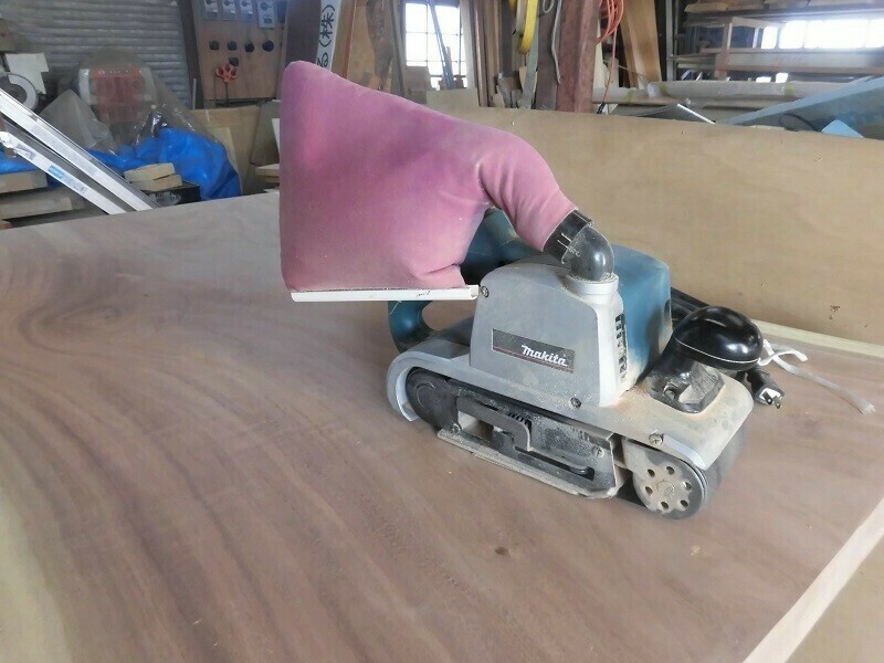 先程の電気カンナが通ったことで出来てしまった板材表面の荒れ、段差をベルトサンダーを使って平らにします。