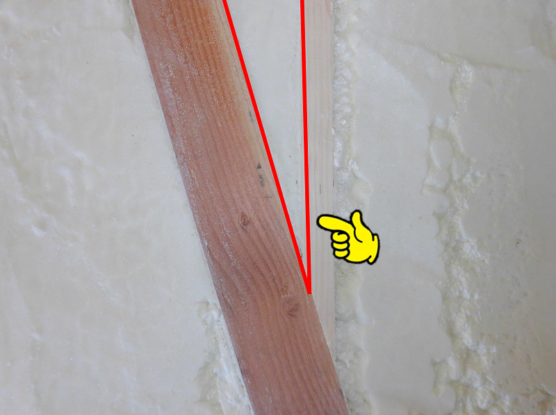 小屋裏に関しては問題ないのですが、壁からはみ出た部分はこの後プラスターボードを張るのに邪魔になってしまうので、また別の職人さんにそれを削ぎ落としてもらっています。