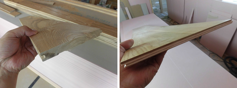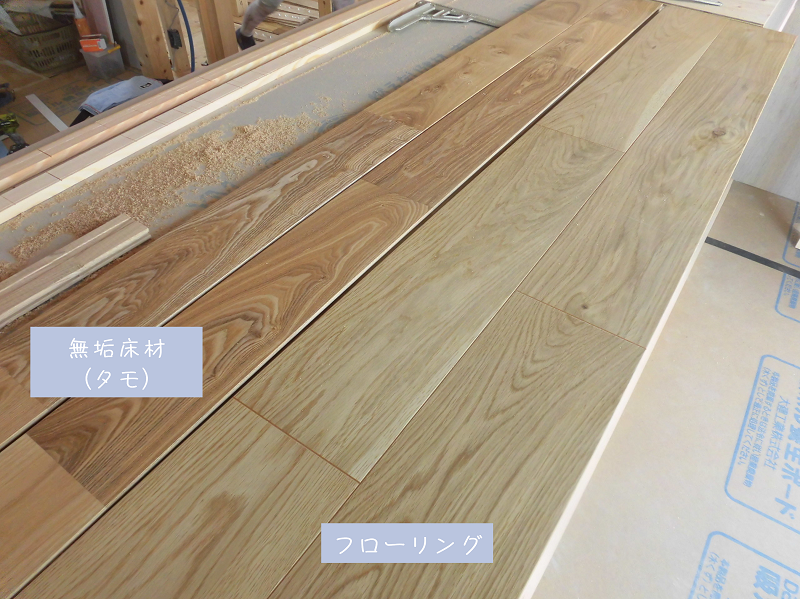左側がタモの無垢床材で、右側は朝日ウッドテックの突板フローリングとなっています。