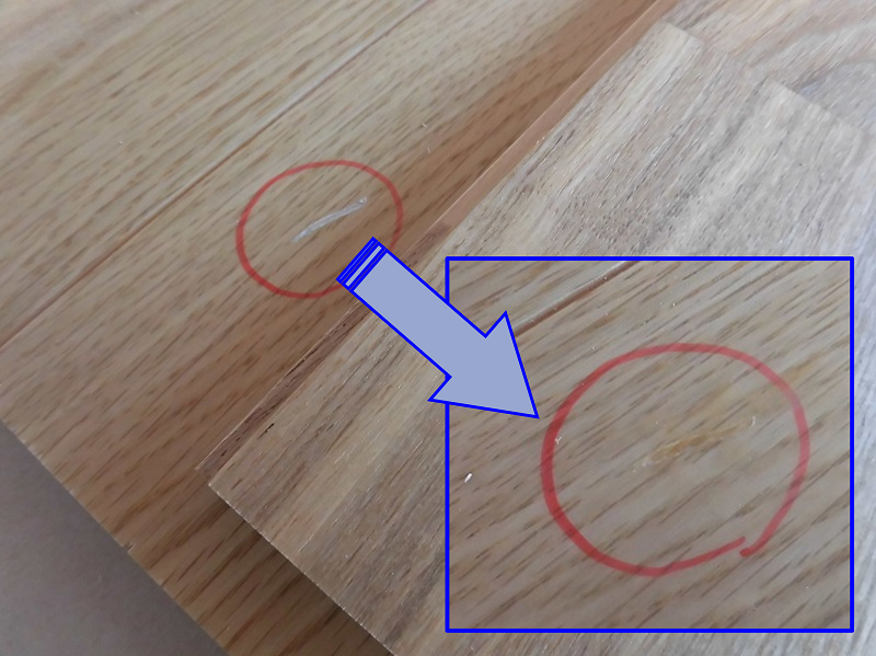 フローリングはそのほとんどがベニヤで構成され、表面のみ化粧が施されているので、正面に疵が付くと中身の合板部分が見えてきてしまいます。