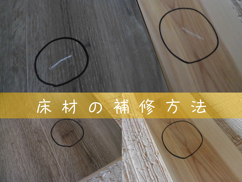 現場に出向いた際にちょうど床材の切れっ端が有ったので、床に疵が付いちゃったときの補修方法の違いをご紹介したいと思います。