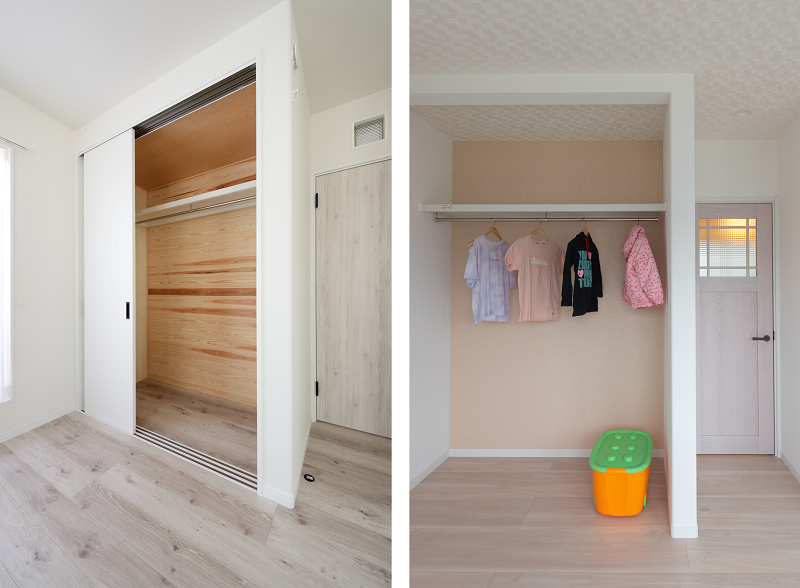 建具のある場合の収納は湿気が籠りやすくもあるので桐や杉を用いて壁を仕上げますが、建具が無ければアクセントクロスで遊び心も出せるし、お子さんにとってはそれが嬉しいポイントになるんじゃないでしょうか。
