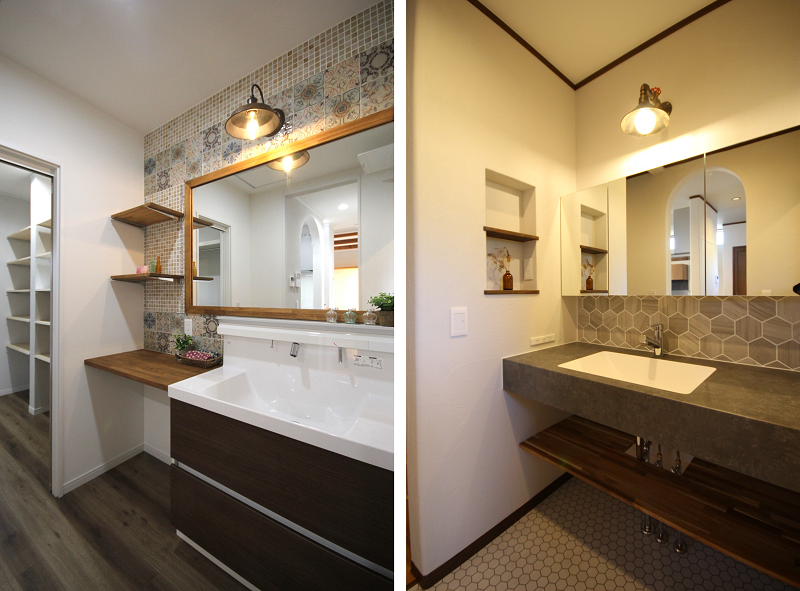 造作の方法としては左の写真のように設備メーカーのキャビネット部を使用しつつ、鏡やサイドのカウンター、背面タイルなどを造作で組み合わせていく、いわば半造作の方法と、右の写真のようにカウンターからフルで造作にする方法があります。