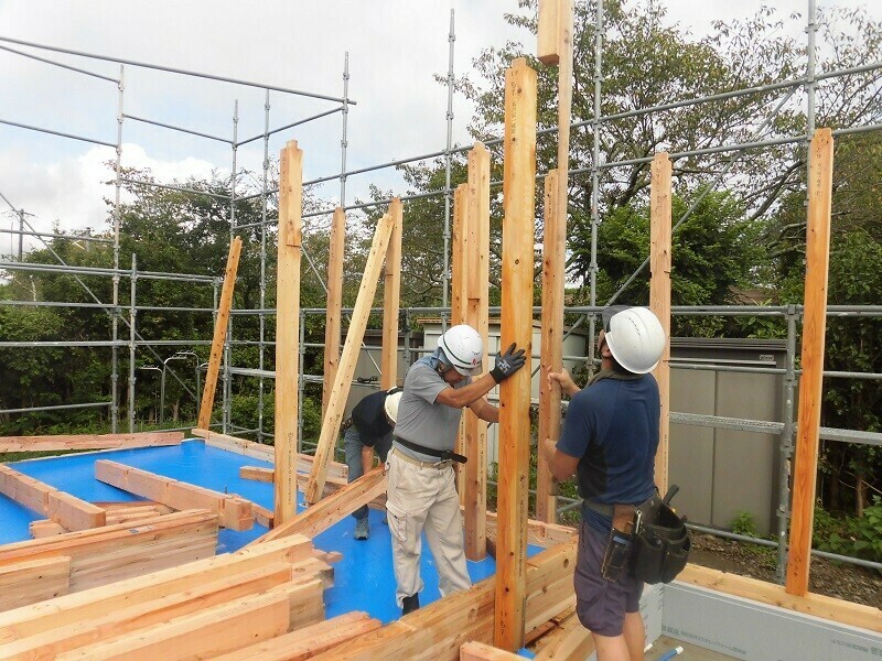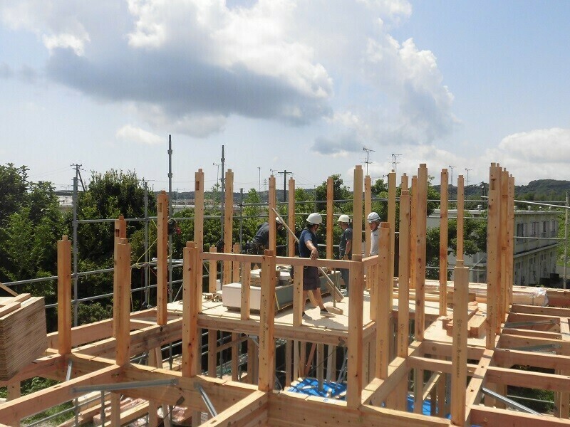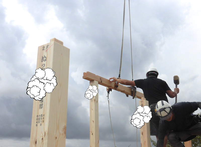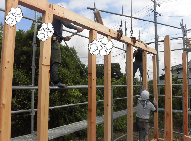 上棟は他にも『棟上げ』とか『建て前』とか、あるいは建築業界用の言葉で『建て方』なんて呼ばれ方もされていて、上棟日には柱や梁などの建物の基本構造となる部分の組み立て作業を大工さん数人掛かりで行います。